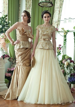 Rochii simple sau sofisticate, cu forme ample sau sirena, volumetrii, fronseuri si drapaje, broderii filigranate lucrate manual, aranjamente florale hand-made, toate realizate din tesaturi fine de matase naturala, shantung, brocart, organza si tafta in carouri.