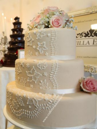 Ce poate exprima mai bine romantismul decat trandafirii si detaliile ce imita dantela? un tort de nunta cu flori si dantela din martipan. Este un tort deosebit pentru o nunta deosebita.