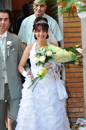 Coafura aleasa de julia25 este una eleganta si foarte feminina, punand in evidenta o frunte inalta ascunsa sub breton ce umbreste ochii mari si albastri ai miresei, diadema este evidentiata de inaltimea cocului iar suvitele aranjate la spate nu doar sustin voalul ci evidentiaza gatul si accesoriile miresei. Este firesc sa zambeasca atat de larg...