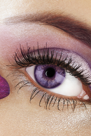 Acest machiaj este potrivit nuntilor cu tema exotica sau celor de pe malul marii. In imagine sunt folosite lentile de contact care se asorteaza atat culorii machiajului cat si florii prinse in par ( se observa un detaliu din petala).