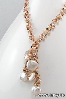 Colier auriu cu perle in culori si marimi diferite, ideal pentru miresele care aleg rochia de mireasa nuantata, disponibil in magazinele Be Precious.