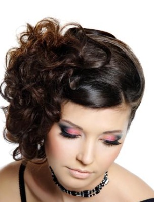 Coafura din imagine este obtinuta prin adunarea parului intr-o parte, apoi pus pe bigudiuri mici.