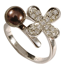 Inel cu un model in forma de floare si o perla inchisa la culoare. Produsul este disponibil pe site-ul CuatroPerla.ro