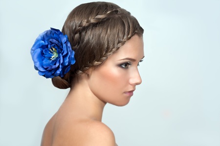 Impletiturile delicate ale acestei coafuri sunt puse in evidenta de floarea puternic colorata ce accesorizeaza foarte frumos cocul bine definit de la baza gatului. Este o coafura perfecta pentru o mireasa ce adopta stilul clasic elegant.