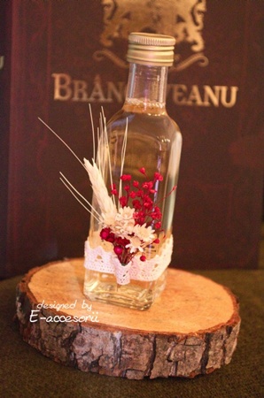 O sticla de vin decorata cu o banda delicata de macrame si floricele natural uscate. Un cadou foarte potrivit pentru o nunta cu tema traditionala.