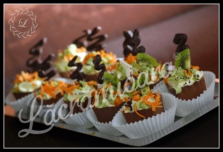 Crema de vanilie cu kiwi, betisoare de cicolata si kiwi proaspat intr-un cosulet de cicocolata neagra. Un desert gustor si racotitor.