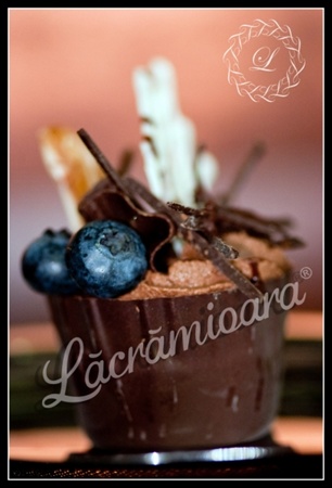 Afine si spuma de ciocolata aranjate frumos intr-un cosulet de ciocolata. O explozie de ciocolata pentru papilele tale gustative.