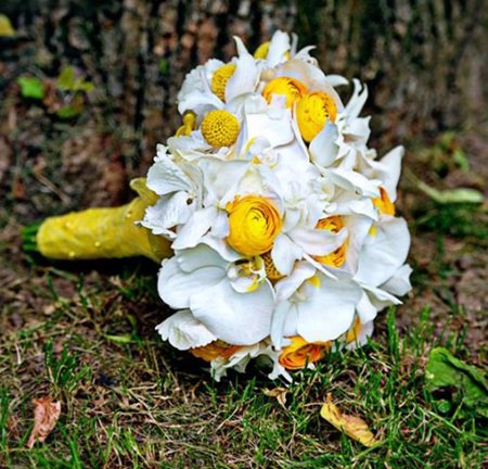 Orhideea alba si delicatele accente galbene fac din acest simplu buchet de mireasa unul special si deosebit.
