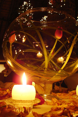 Pentru o nunta organizata la mare, in aer liber, pe plaja, acest decor este ideal. Culorile, petalele de trandafiri, lumanarile parfumate si vasul decorativ creaza o puternica atmosfera romantica.