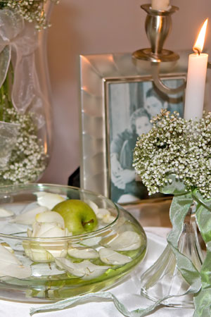 Potrivit oricarui sezon, acest decor inspira romantism prin lumanarile aprinse si frumos ornamentate cu flori albe si mici, ce dau impresia unor margelute. Materialul pentru fetele de masa este unul matasos, fin la atingere si care reflecta bine lumina, participand la crearea unui decor deschis, luminos. Pe masa puteti pune o poza cu voi cand va imbratisati.