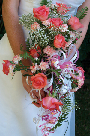 Un buchet modern stil "cascada" ce imbina trandafiri si garoafe in nuante puternice de rosu-portocaliu, ornat cu plante bine alese.