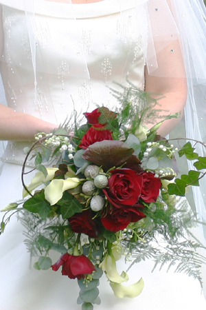 Un buchet modern, cu o forma nedefinita, ce imbina trandafiri cu cale. Nunatele sunt puternice si este un buchet care poate fi purtat oricand.