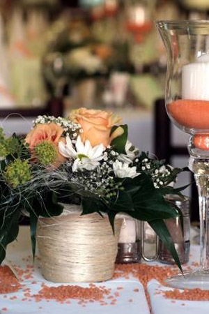 Acesta este un decor de nunta usor de realizat care are cateva elemente principale: o vaza mica, joasa de flori peste care s-a infasurat un snur auriu. Puteti pune orice alta culoare, aceasta insa potrivindu-se de minune temei cromatice alese. Decorul floral nu este foarte complicat, foloseste cativa trandafiri portocalii, margarete si elemente decorative. Langa se afla un fahar in care s-au presarat cateva granule si peste care s-a asezat o lumanare alba ce asorteaza cu margaretele. Pe masa sunt presarate cateva granule portocalii... si gata decorul!