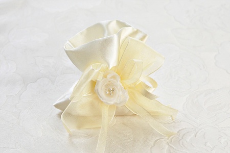 Marturie nunta saculet de satin decorat cu panglici de organza si trandafiri.Pret: 3,99 Lei