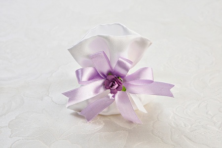 Marturie nunta saculet de satin decorat cu panglici satinate si trandafiri.Pret: 3,99 Lei