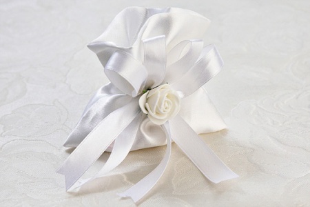 Marturie nunta saculet de satin decorat cu panglici satinate si trandafiri.Pret: 3,99 Lei