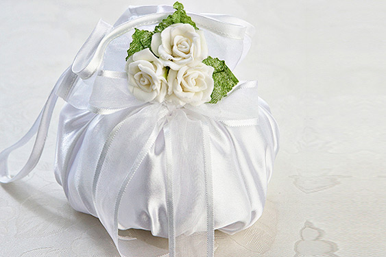 Poseta mireasa realizata din satin si organza , decorata cu panglici de organza si trandafiri. Se poate personaliza schimband culoarea decoratiunii.Pret: 30,5 Lei