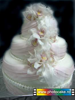 Tort de nunta cu panglica roz si crini regali disponibil in cofetariile Photocake.ro