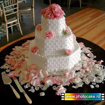Tortul miresei cu perle si trandafiri roz realizabil in cofetariile Photocake.ro