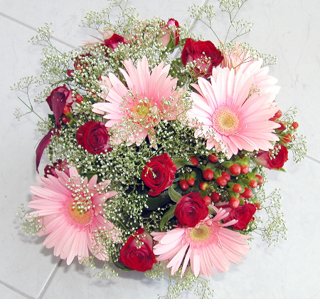Un buchet de mireasa fantezist, alcatuit din gerbere roz si trandafiri rosii.