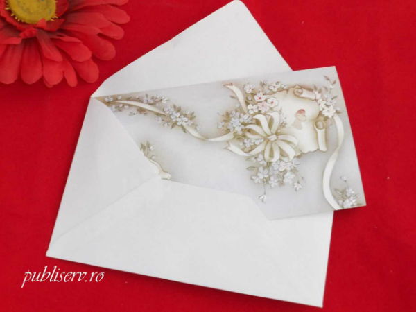 Invitatia se pliaza in doua. Textul se scrie in interior, pe partea dreapta. Produsul este disponibil pe site-ul Publiserv.ro