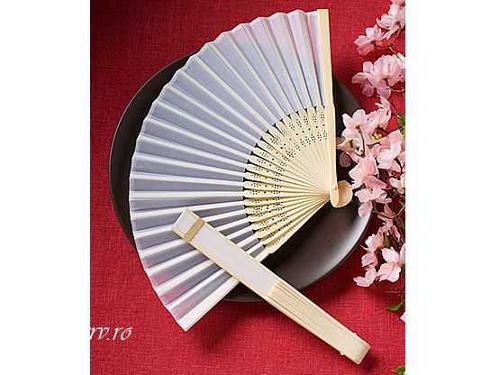 Evantaiul din matase este util in zilele insorite de vara.Baza eventaiului este realizata din lemn de santal cu decupaje florale. Fiecare eventai vine ambalat intr-o cutie alba din carton care poate fi personalizata la cerere prin atasarea unei panglici si a unei etichete!