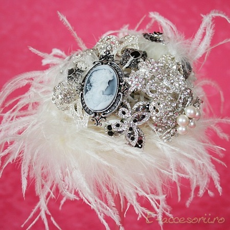 Special pentru miresele extravagante propun acest buchet de mireasa realizat din pene, fulgi si brose in stil vintage care cu siguranta vor atrage toate privirile.