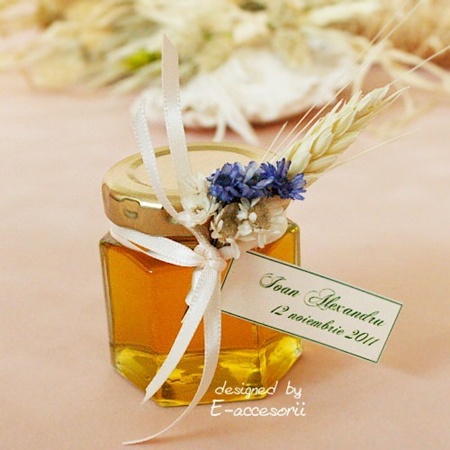 Un cadou dulce pentru invitati: borcanas cu miere de albine, decorat cu flori natural uscate si un spic de grau pentru noroc!