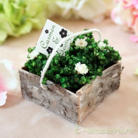 Un cosulet din scoarta de mesteacan umplut cu floricele vesele spre bucuria invitatilor.