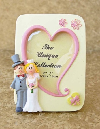 Marturie nunta speciala din ceramica in forma de inimioara cu mire si mireasa, in interiorul careia se pot pozitiona diferite fotografii cu voi pentru o amintire unica.