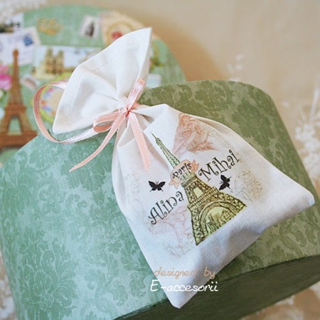 Marturie in forma de saculet personalizat cu imaginea celebrului Turn Eiffel. La cerere, imaginea grafica se poate modifica.