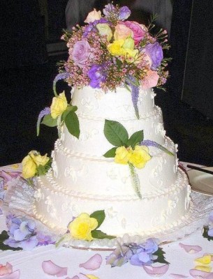 Tortul este accesorizat cu flori colorate care trebuie asortate florilor de nunta.