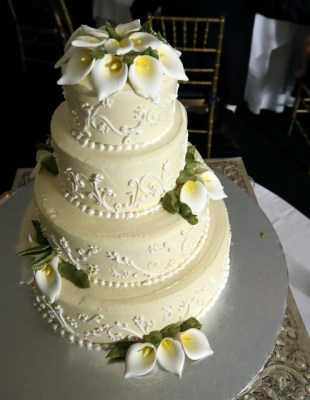 Tortul de nunta se preteaza unei nunti elegante, cu tema florala de cale.Tortul este accesorizat cu perle.