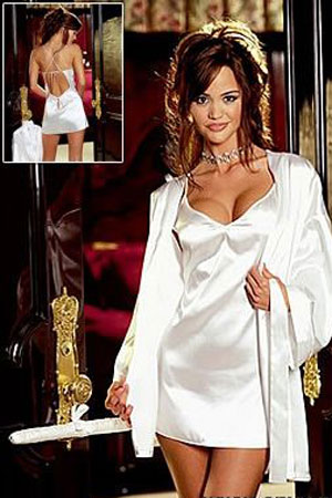 Pentru miresele care vor sa isi cucereasca sotul prin eleganta, simplitate, feminitate si totodata tinuta sexy pot opta pentru acest set format dintr-o rochita decupata la spate si un halat confectionat din satin. Setul este disponibil si in variantele rosu, negru si roz in magazinele Just4girls.