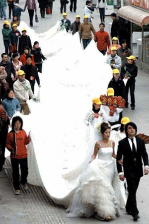 Este foarte adevarat ca in vremurile medievale lungimea trenei era corelata cu rangul social, nobilele mirese avand trene lungi. Insa decorul si fastul din vremurile acelea se potriveau. Aceasta mireasa doreste poate sa isi arate rangul social prin lungimea trenei, insa decat aspectul unui cearsaf purtat haotic de o multime de oameni cu haine care mai de care mai colorate... mai bine fara! Sursa imaginilor: Trilulilu