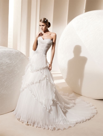 Rochie de mireasa cu volane mari din material plisat disponibila in Magazinele Biensavvy.ro, colectia La Sposa 2011.Mai multe