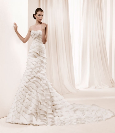 Rochie de mireasa cu volane suprapuse simple, disponibila in Magazinele Biensavvy.ro, colectia La Sposa 2011.Mai multe