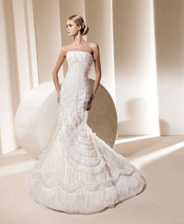 Rochie de mireasa fara bretele cu linii moderne create de volanase delicate, disponibila in magazinele Biensavvy, colectia la Sposa 2011.