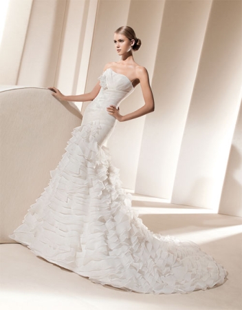 Rochie de mireasa stil sirena cu valuri cu volanase si coreset cu model pliat, disponibila in magazinele Biensavvy, colectia La Sposa 2011.