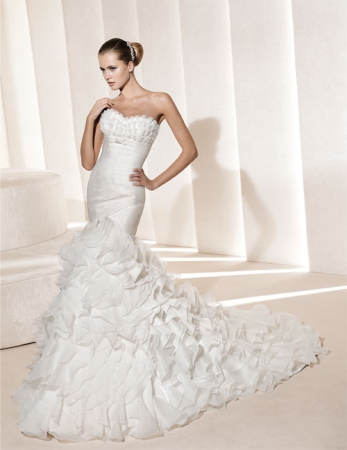 Rochie de mireasa stil sirena cu volanase pe fusta si corset, disponibila in Magazinele Biensavvy.ro, colectia la Sposa 2011. Mai multe