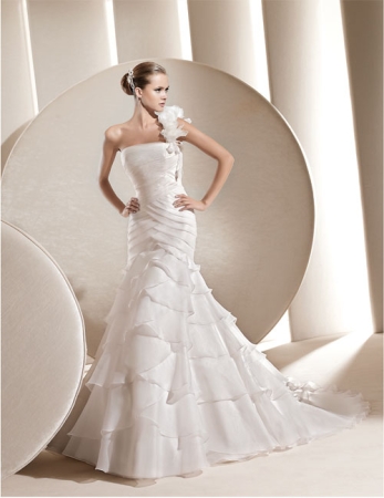 Rochie de mireasa "in valuri" cu flori pe un umar, ce creaza iluzia de inaltare datorita dimensiunii crescatoare a volanaselor, disponibila in Magazinele Biensavvy.ro, colectia La Sposa 2011.
