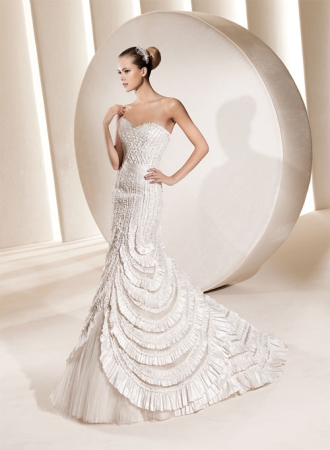Rochie de mireasa cu model in semicercuri create din volanase, disponibila in Magazinele Biensavvy, colectia La Sposa 2011.