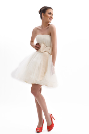 Rochie alba fara bretele cu funda crem disponibila in magazinele Calin Events.