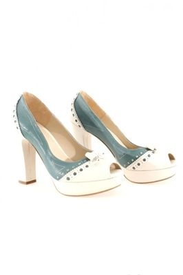 Pantofi cu toc inalt si platforma, decupati in dreptul degetelor, bej cu turcoaz. Au un model decorativ perforat si o funda in partea din fata. Se poarta la tinute de seara sau zi, atunci cand participi la un eveniment mai deosebit. Pantofi disponibili in magazinele FashionUp