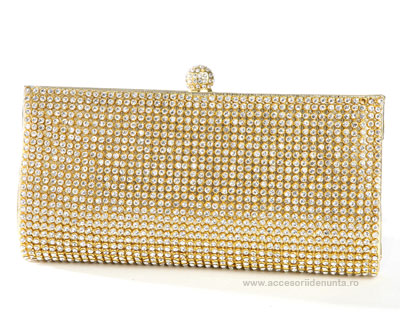 Mireasa va straluci in ziua nuntii cu aceasta poseta Sparkle. Decorata cu strasuri, aceasta poseta este potrivita si pentru ocazii. Este in forma de plic. Disponibila pe culorile argintie si aurie. Pret 94$. Produsul este disponibil pe site-ul Accesoriidenunta.ro