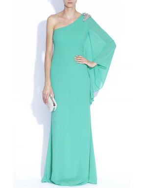 Rochie de seara lunga, asimetrica, realizata din voal si decorata pe umar cu un element realizat din pietre si margele cusute manual.