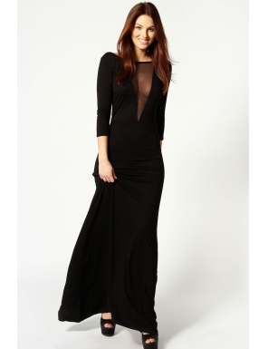 Rochie de seara neagra, cu un decolteu adanc acoperit cu un voal transparent.
