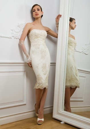 Pentru miresele care prefera rochiile scurte in locul celor de printesa, si nu vor o rochie alba, aceasta varianta este una dintre cele mai elegante. Purtata cu un coc simplu si un machiaj retro, vei avea o tinuta impecabila si remarcabila.