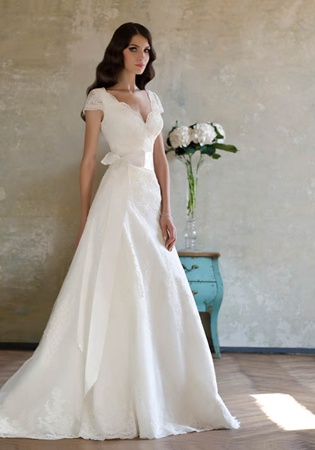 Pentru un look ravasitor de delicat in cea mai frumoasa zi din viata ta, alege dantela. Nimic nu poate fi mai frumos, mai pretios si sofisticat decat o rochie de mireasa din dantela, cu maneci delicate, cu trena, decolteu in V si talie accentuata de o panglica fina de satin.
