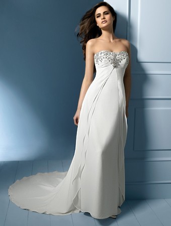 Aceasta rochie de mireasa pune forte mult accent pe bust atat prin linia fluida cat si prin aplicatiile de pietre.